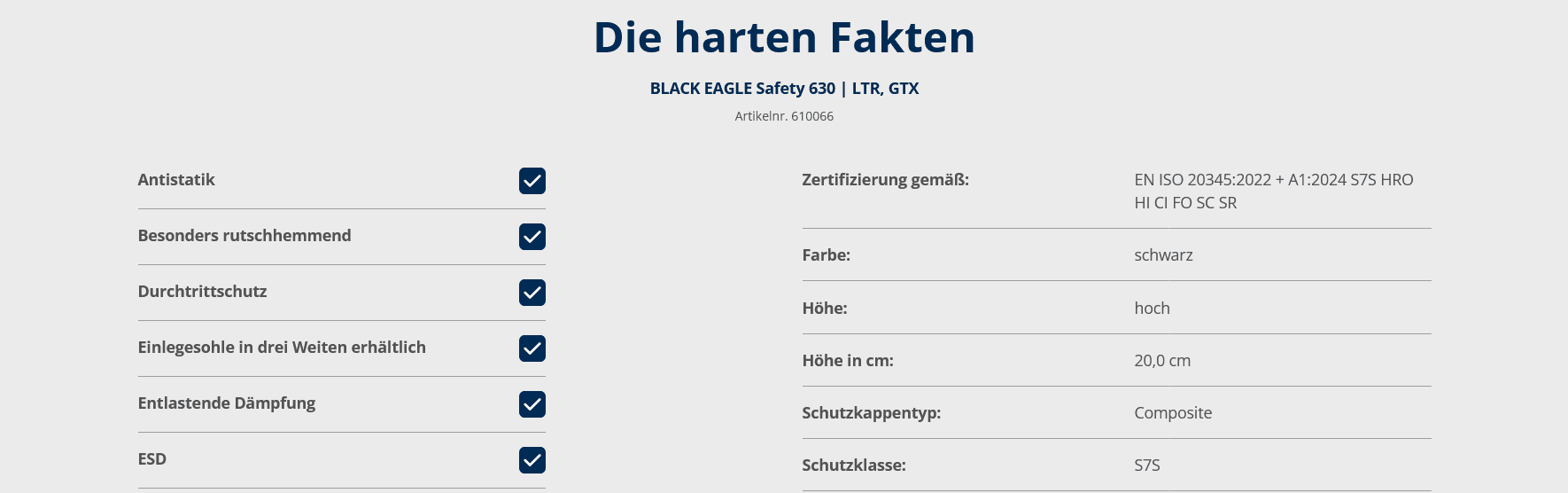 Der HAIX Black Eagle Safety 630 LTR GTX ist nach EN ISO 20345:2022 + A1:2024 zertifiziert und erfüllt die Sicherheitsklasse S7S.